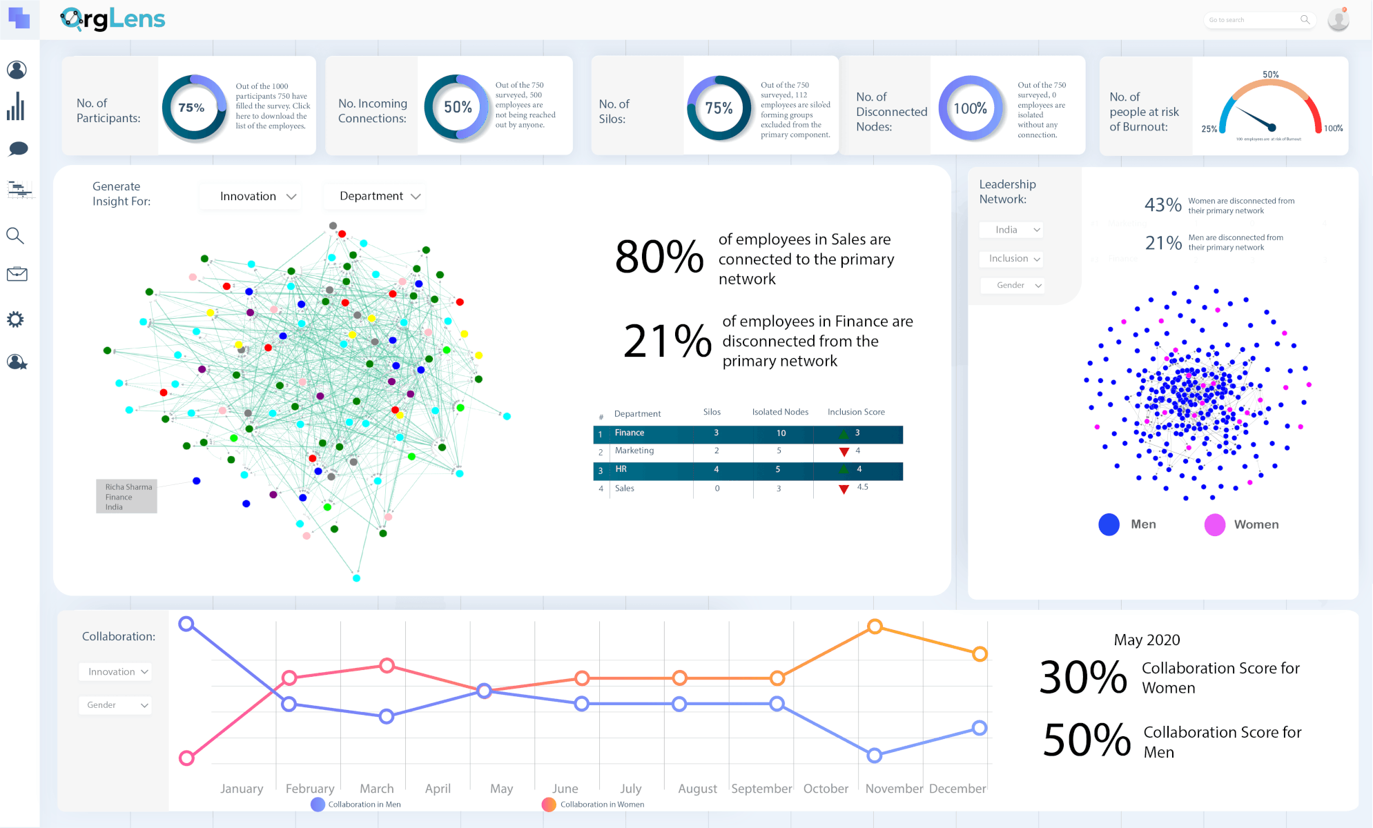 Understand how work and ideas move across teams. OrgLens reveals collaboration strengths and gaps, helping leaders improve engagement and cross-functional performance.